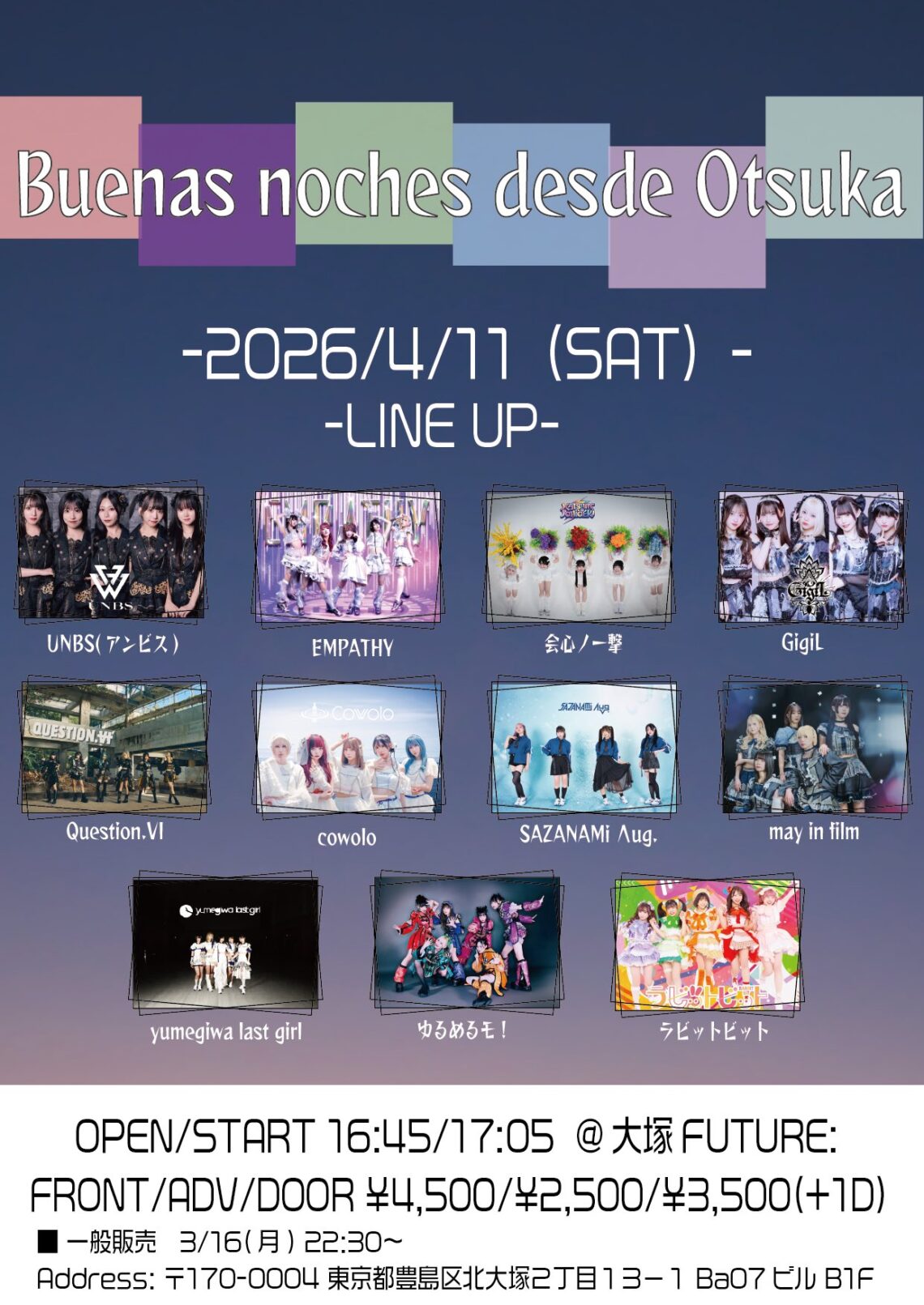 • 出演 UNBS(アンビス) / EMPATHY / 会心ノ一撃 / GigiL / Question.VI / cowolo / SAZANAMi Λug. /may in film / yumegiwa last girl / ゆるめるモ! / ラビットビット